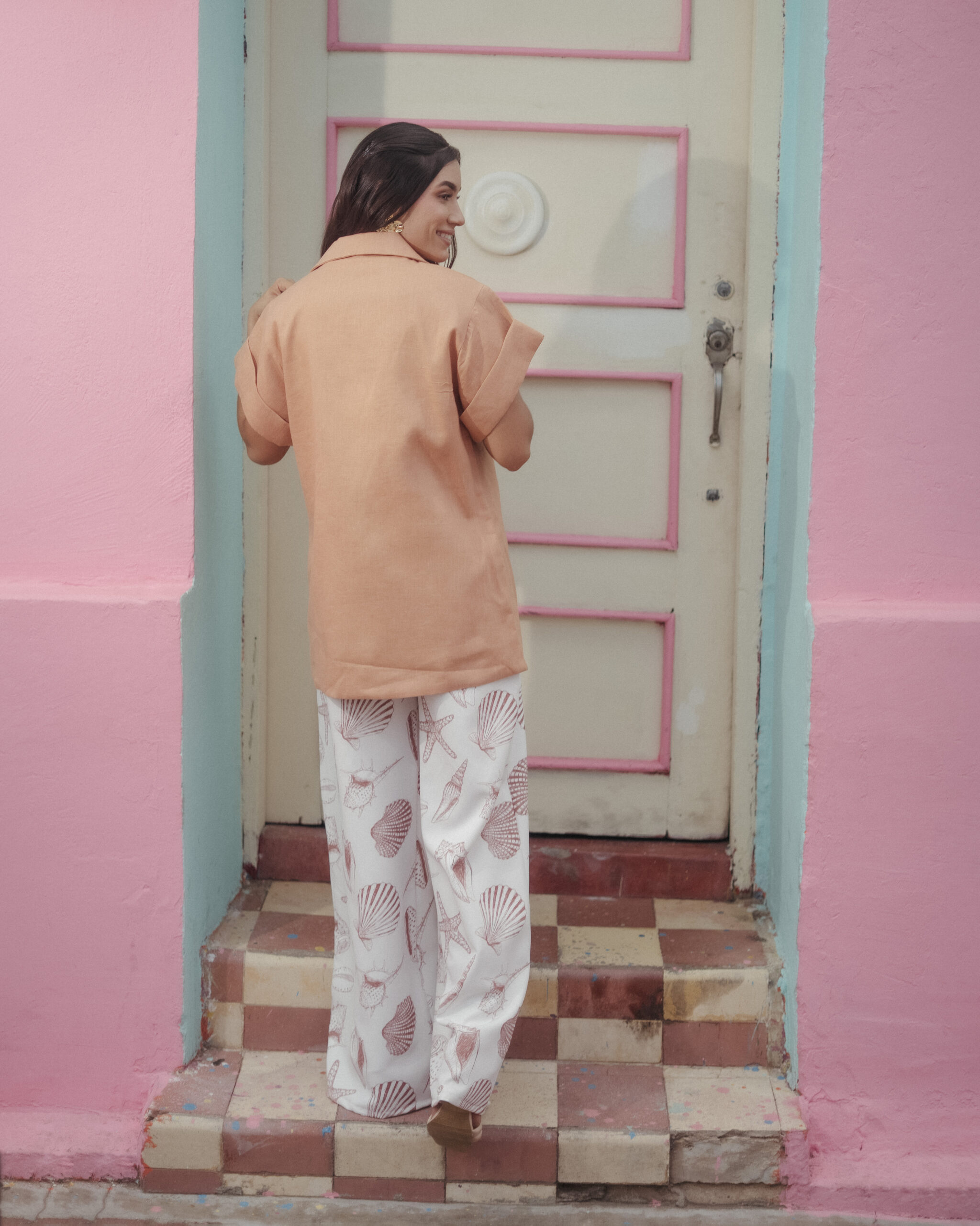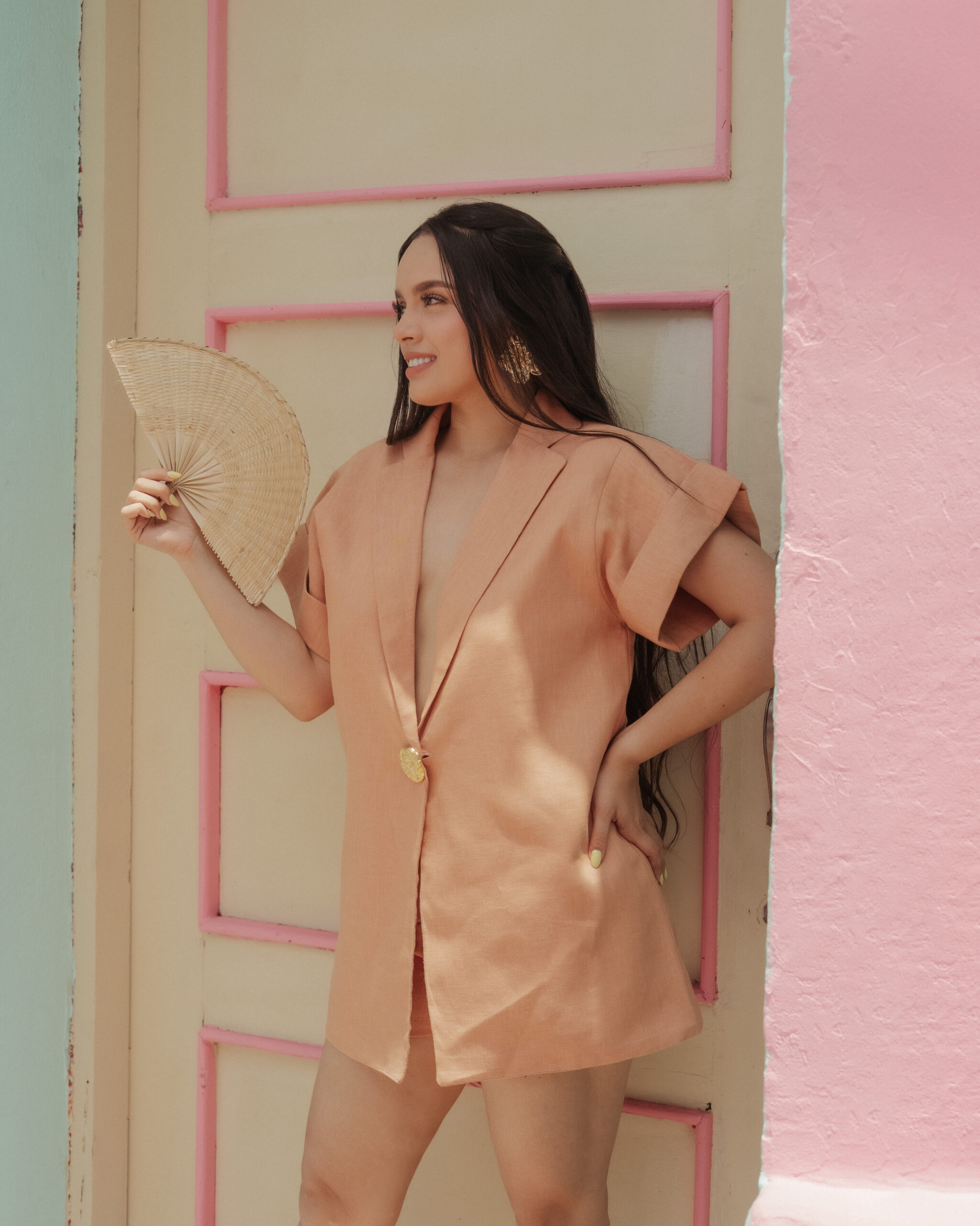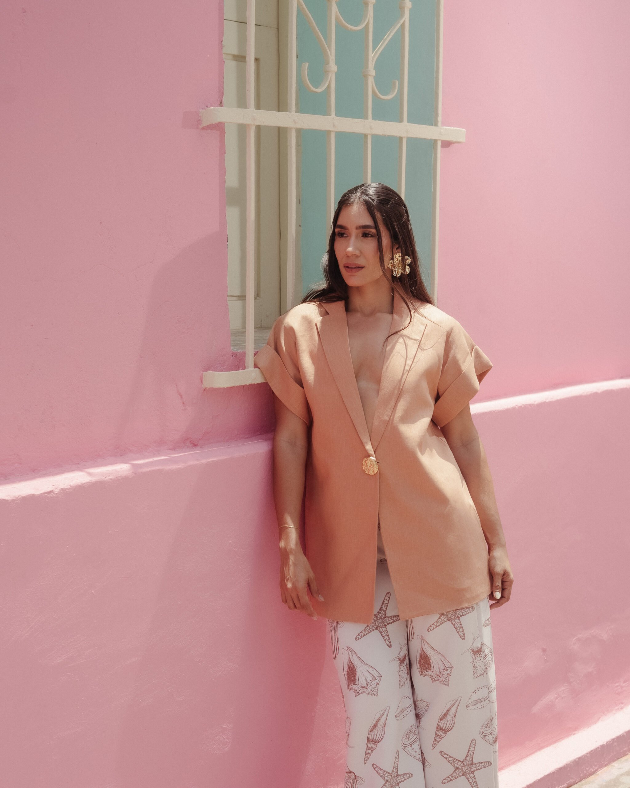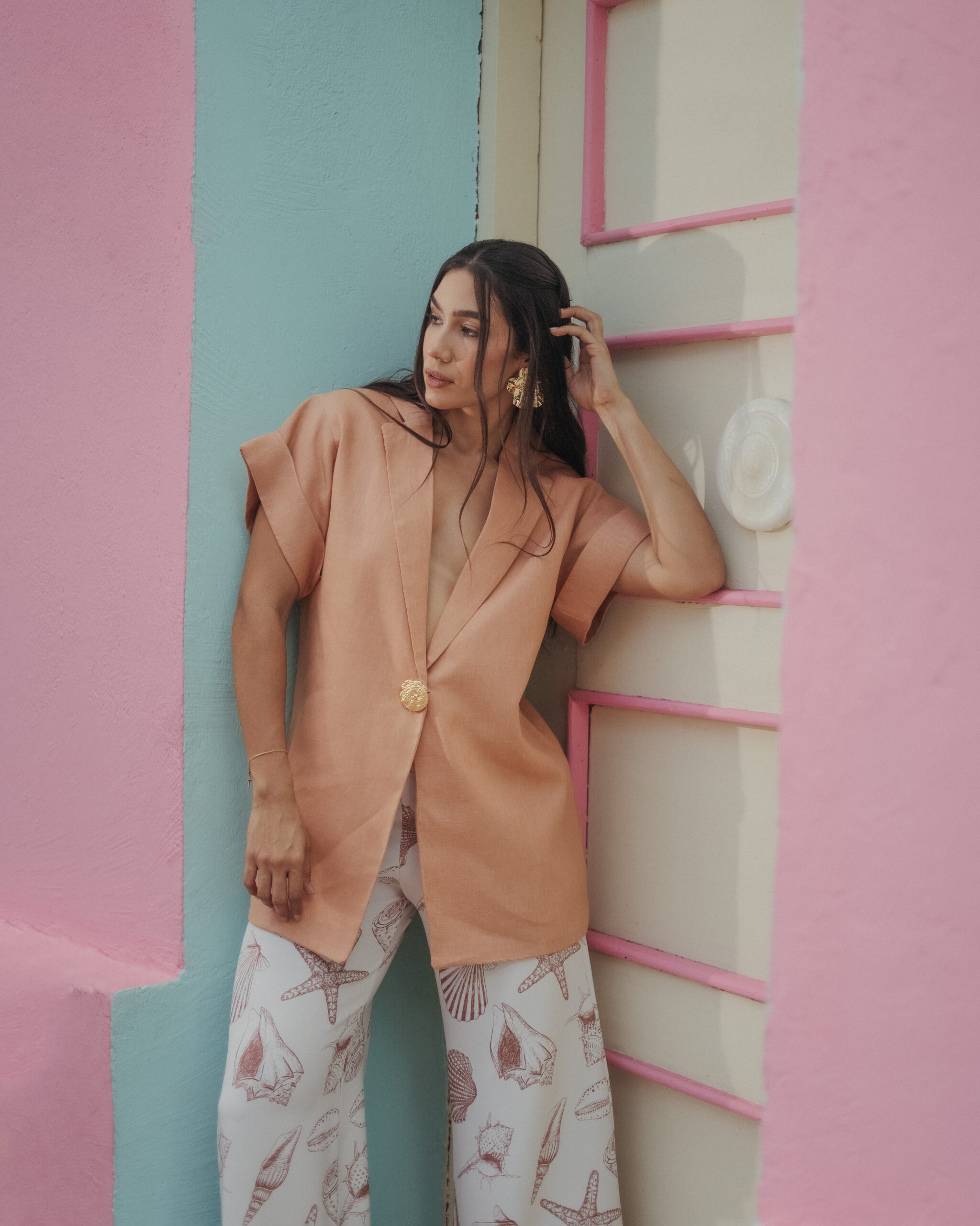 Blazer elaborado en lino en tono cálido, de corte relajado y escote profundo que estiliza la figura. Perfecto para un look elegante y fresco en cualquier ocasión.