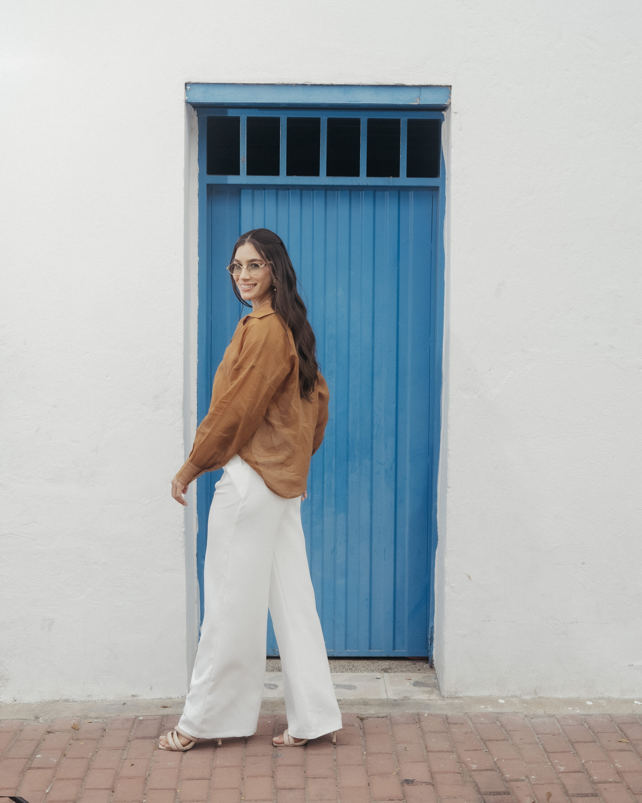 El pantalón que acompaña la camisa es el pantalón ref. Elisa.