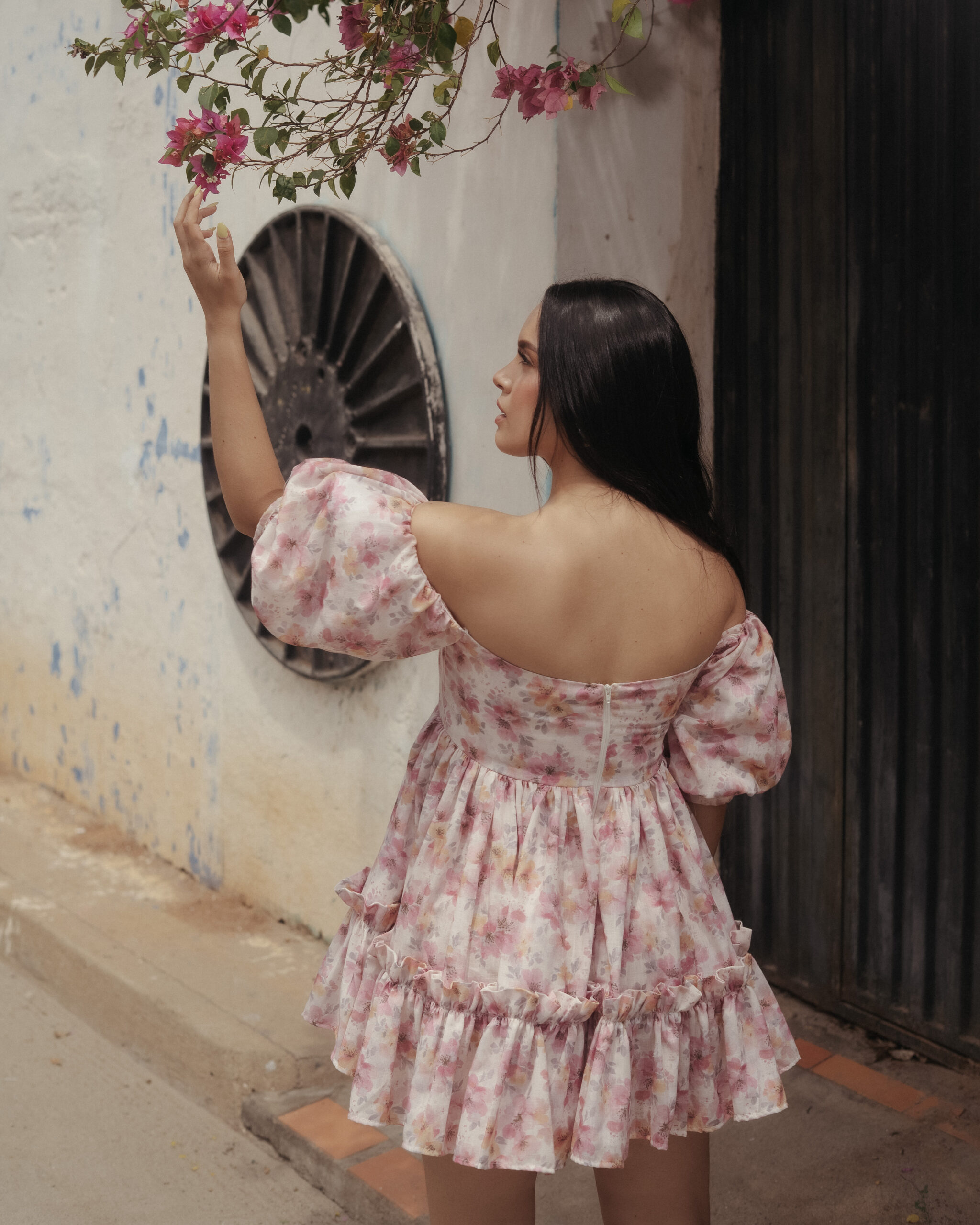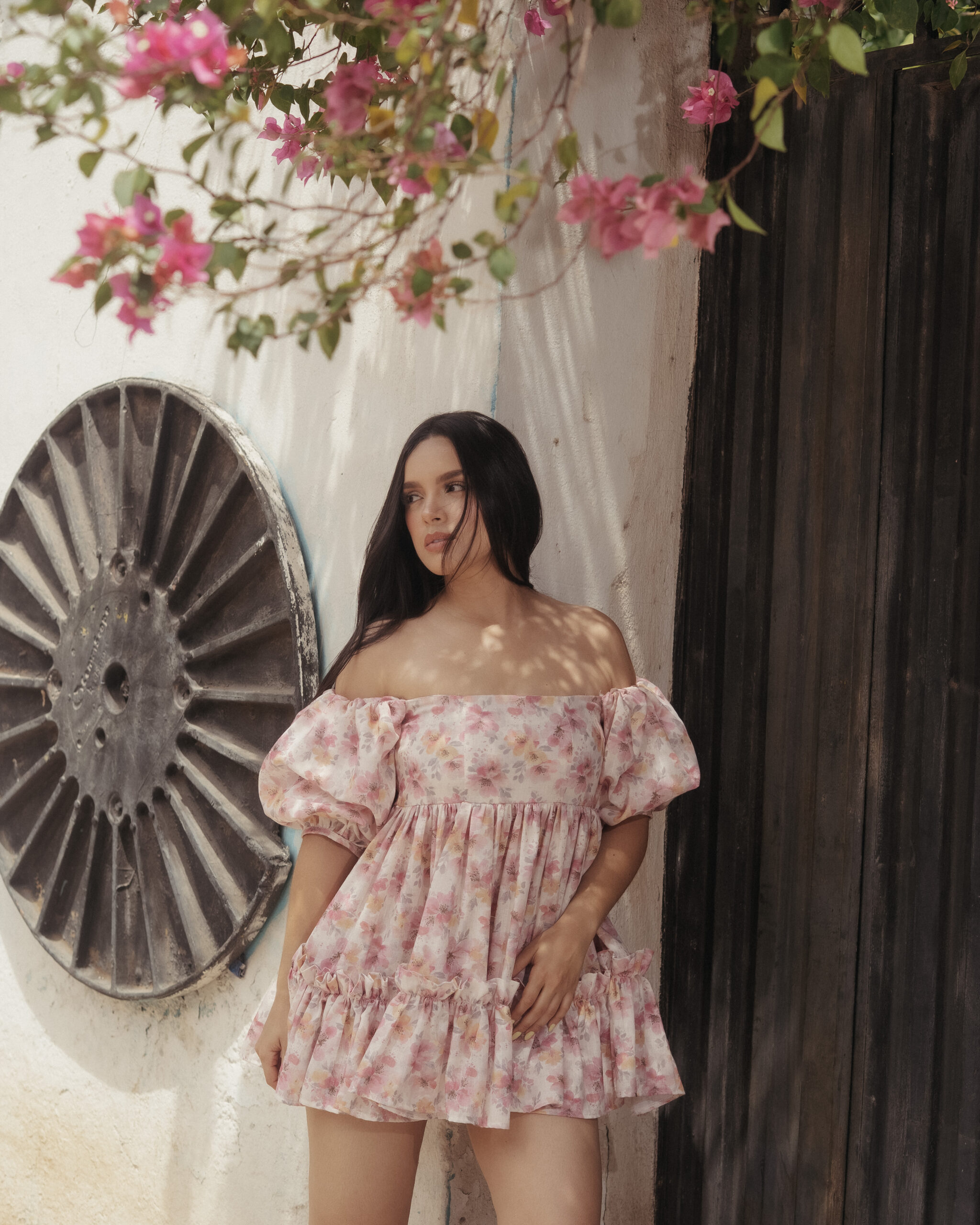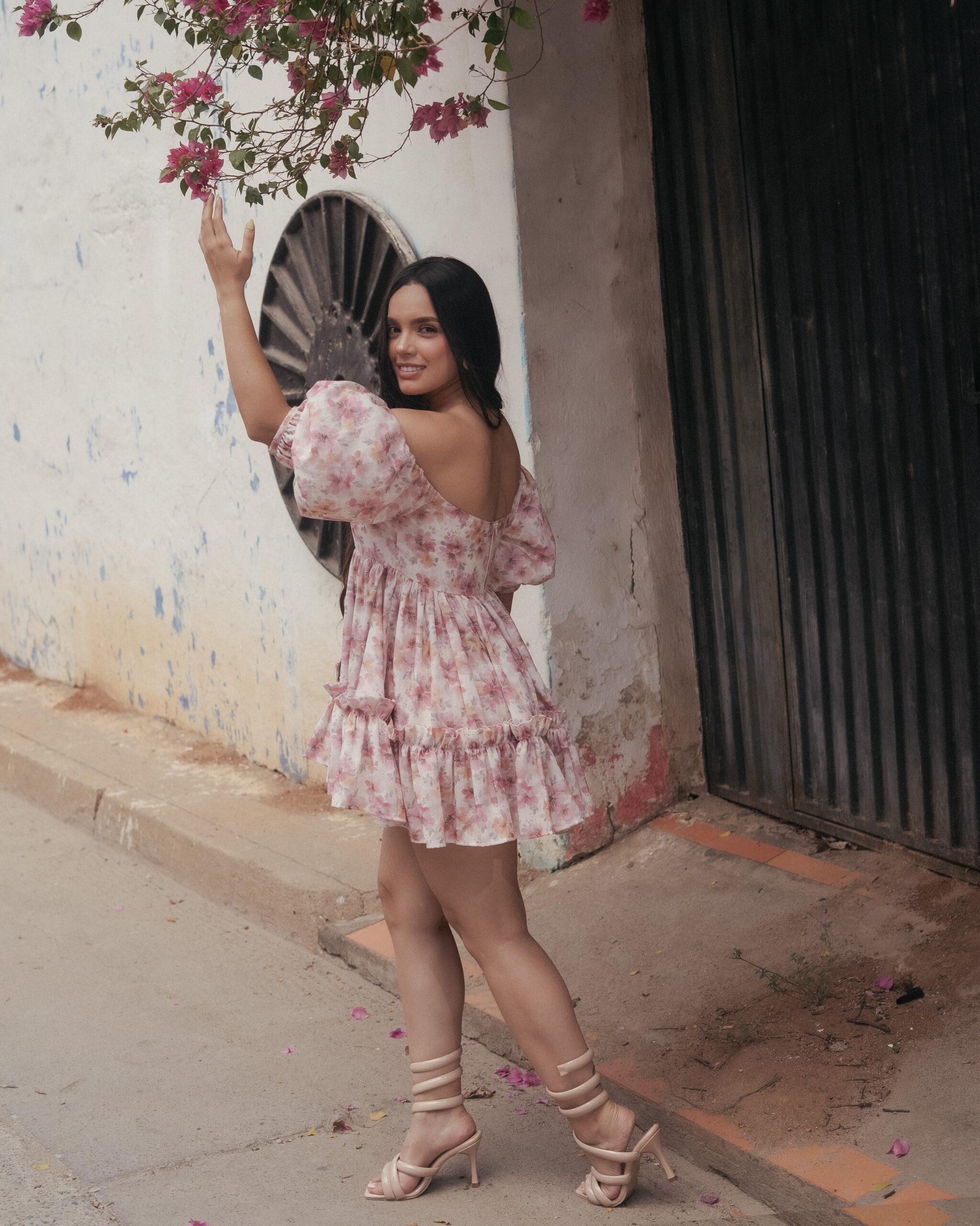 Con estampado floral en tonos suaves y hombros descubiertos, es la combinación perfecta entre frescura, romanticismo y estilo. Su silueta fluida y mangas abullonadas lo hacen ideal para destacar con un look femenino y delicado en cualquier ocasión.