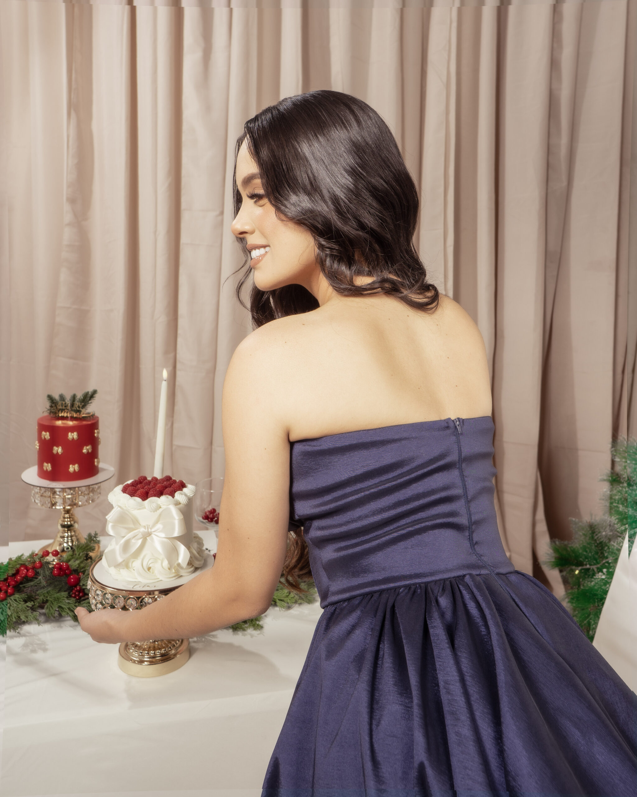 Vestido tipo corset con falda globo elaborado en 100% poliéster, cierre en la parte de atrás
