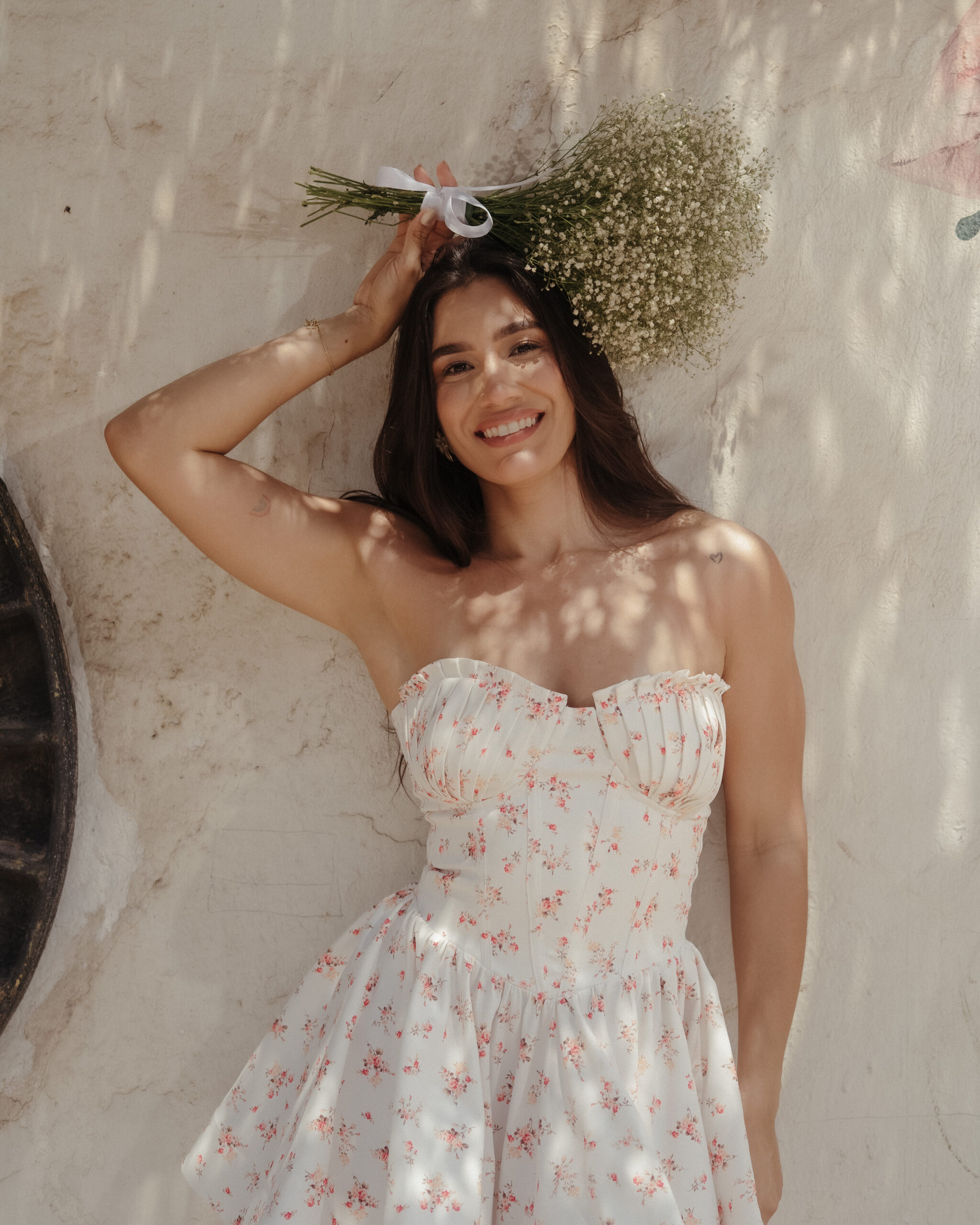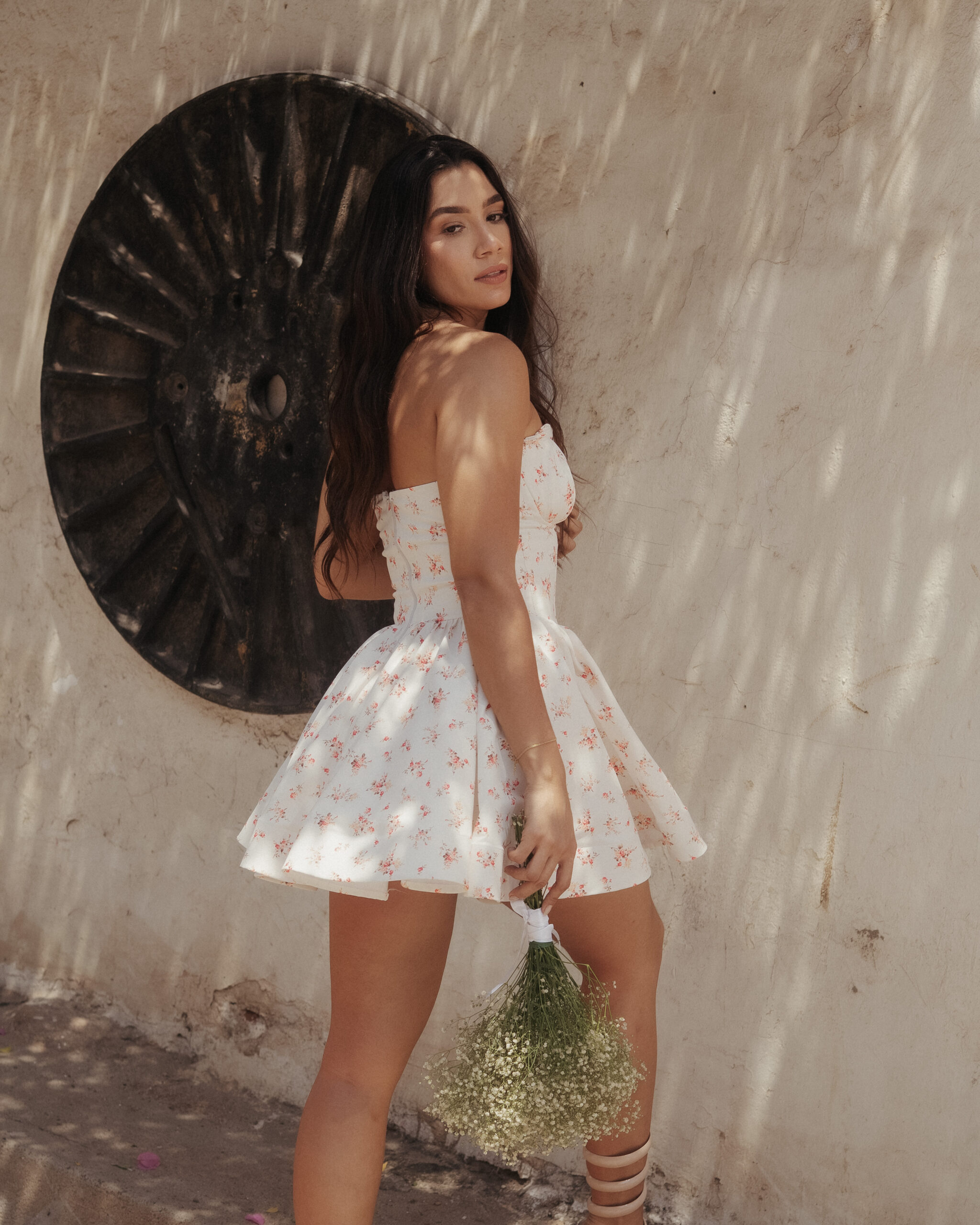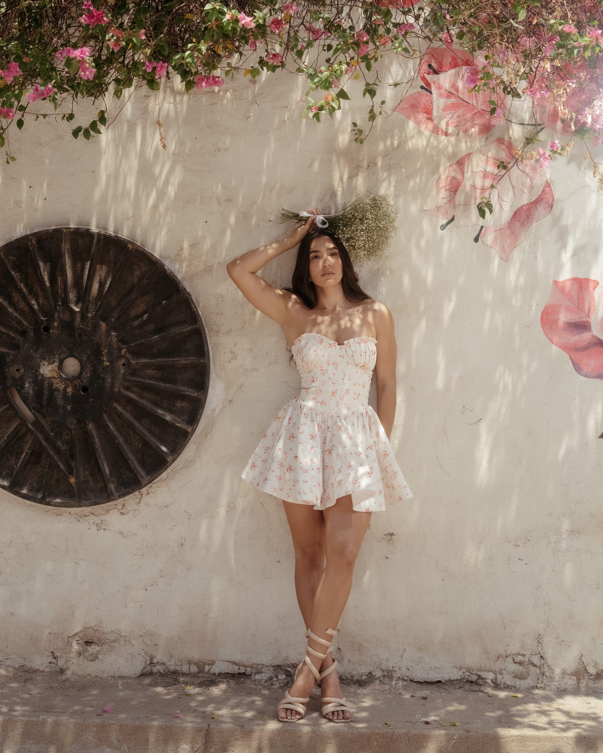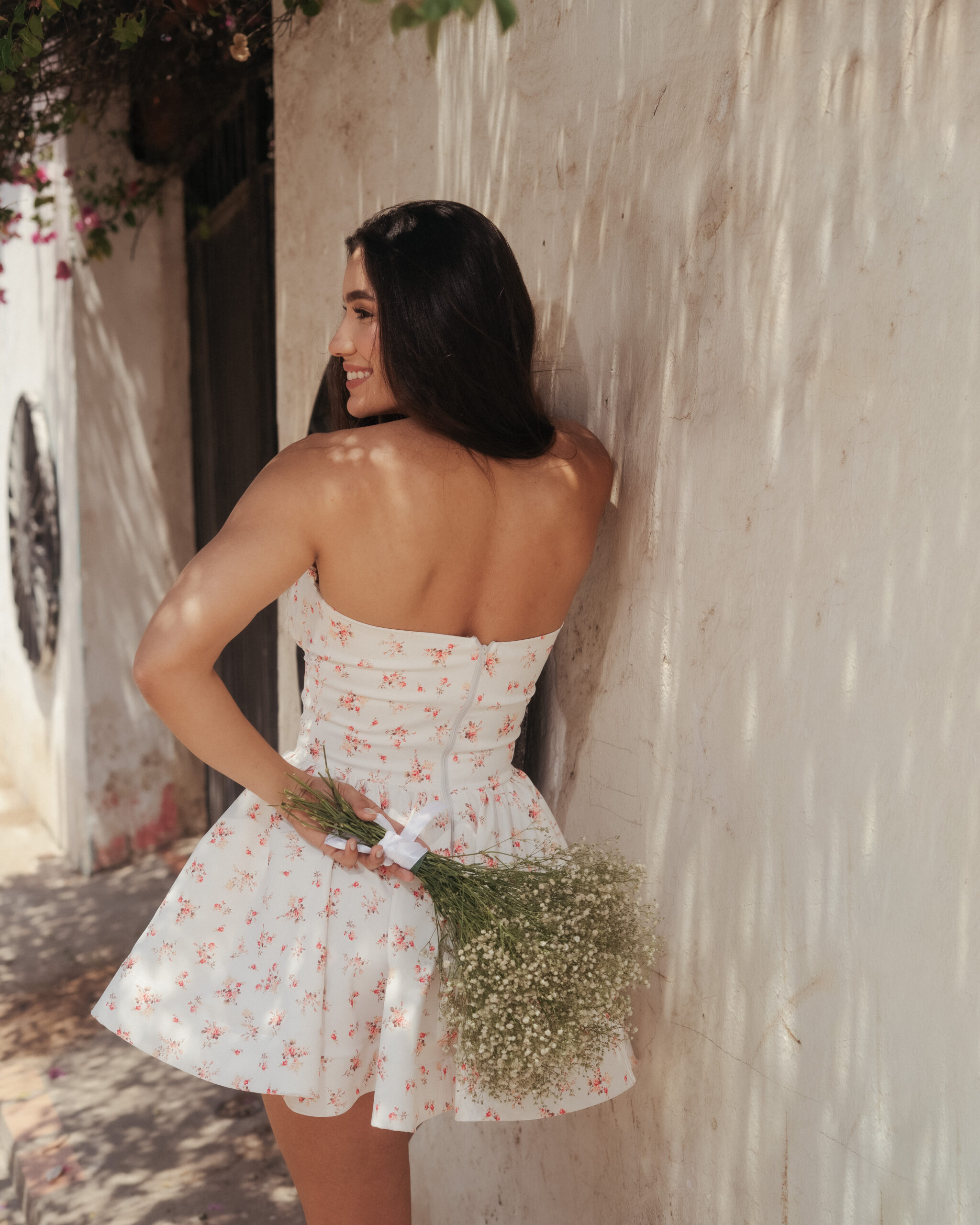 Vestido corto con estampado floral, escote strapless y falda con vuelo que aporta movimiento y feminidad. Ideal para brillar en días soleados.