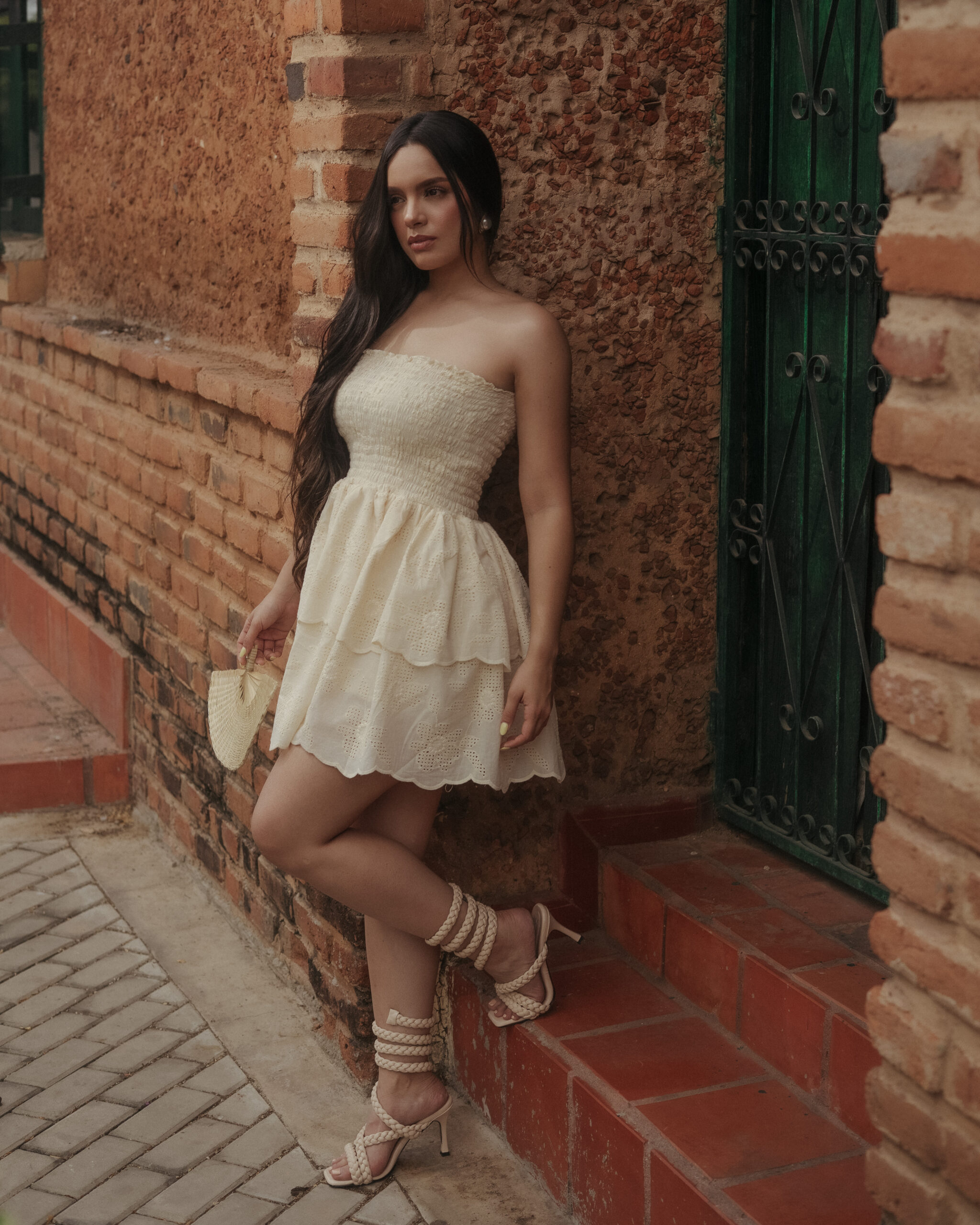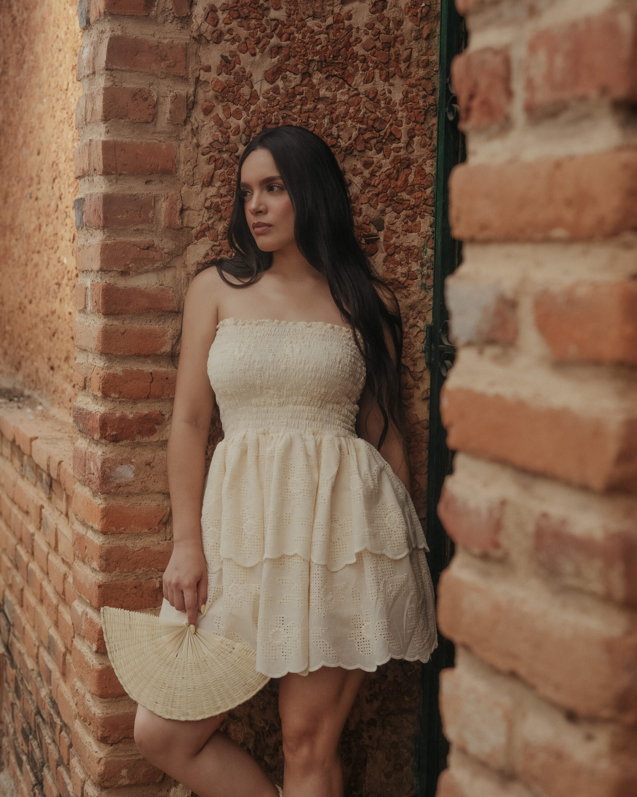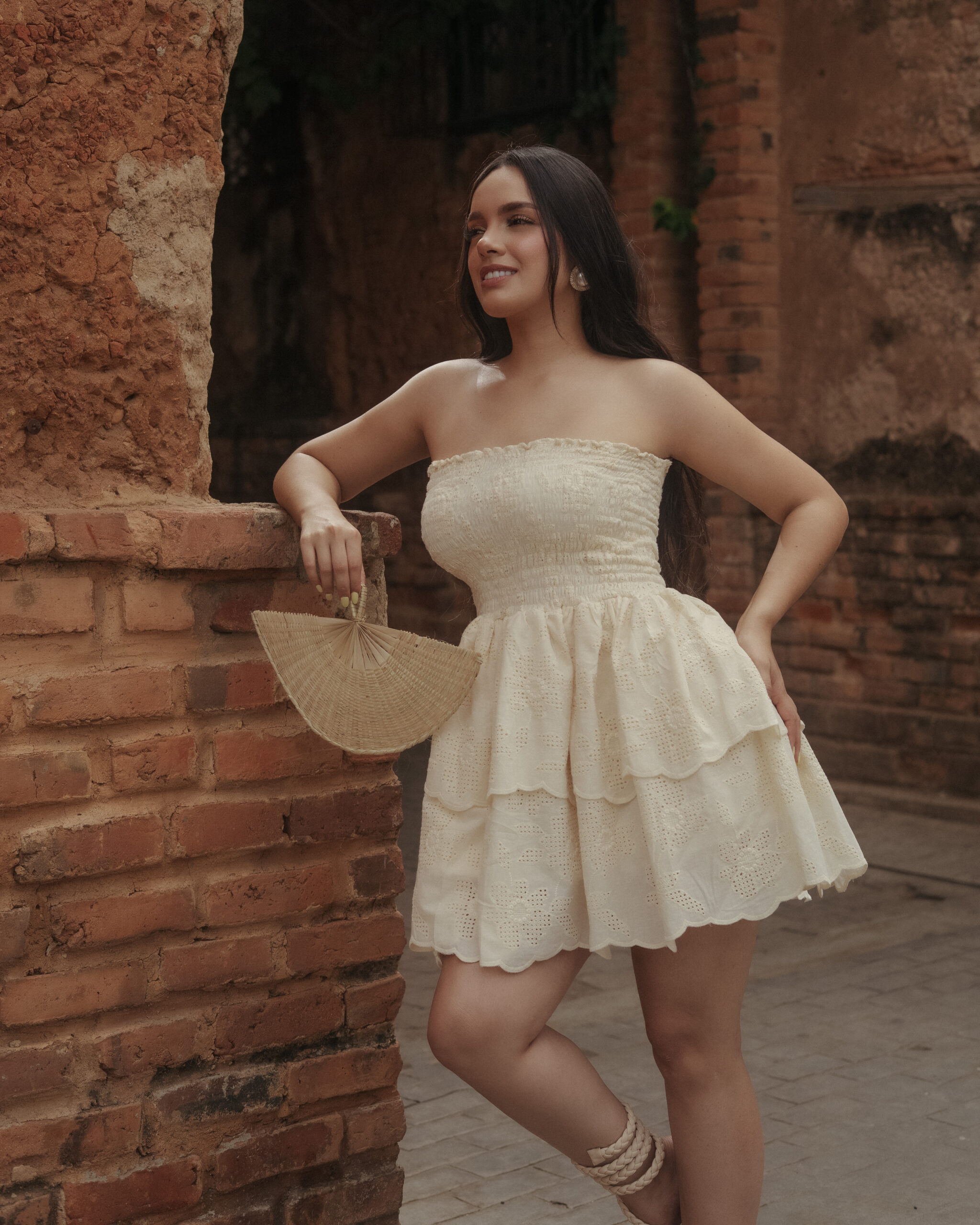 Vestido corto strapless en tono marfil en ojalillo y falda en capas que aporta volumen y movimiento. Un diseño fresco, femenino y perfecto para destacar con un look romántico.