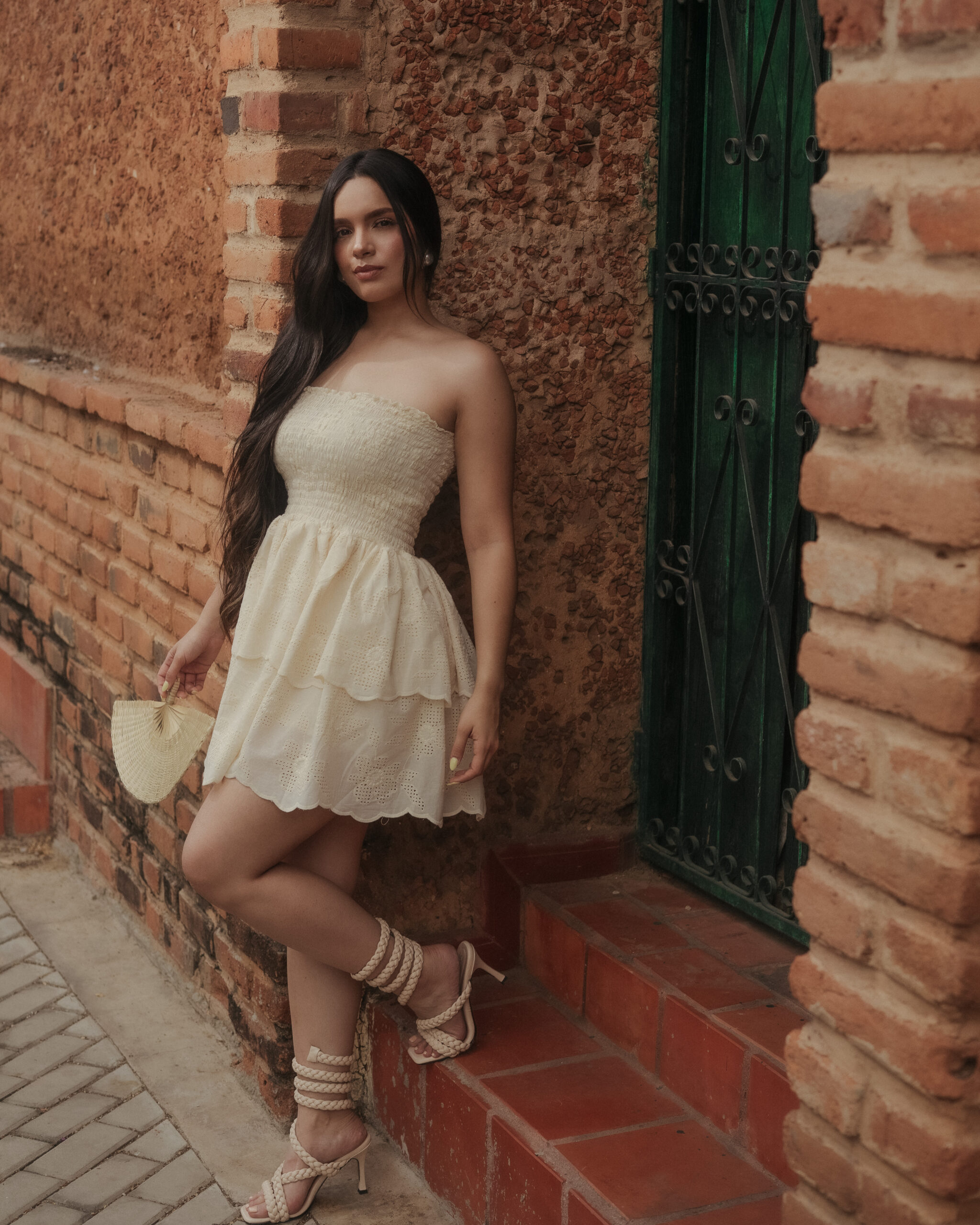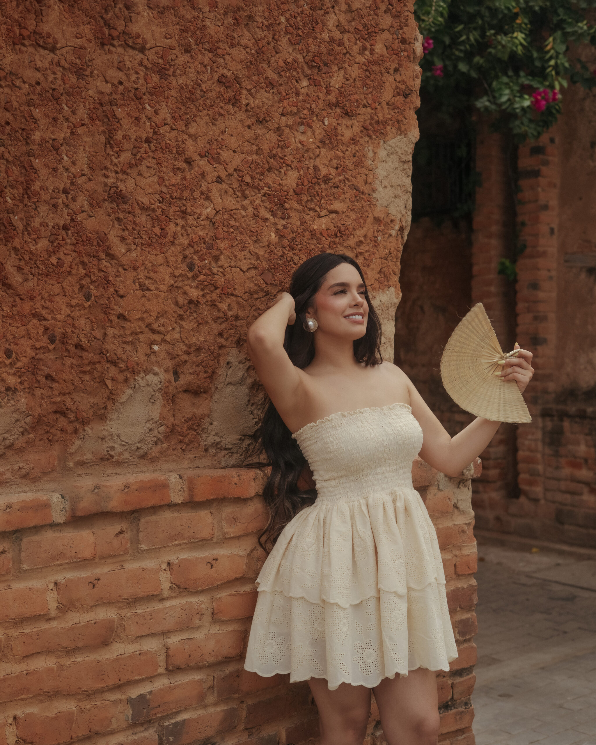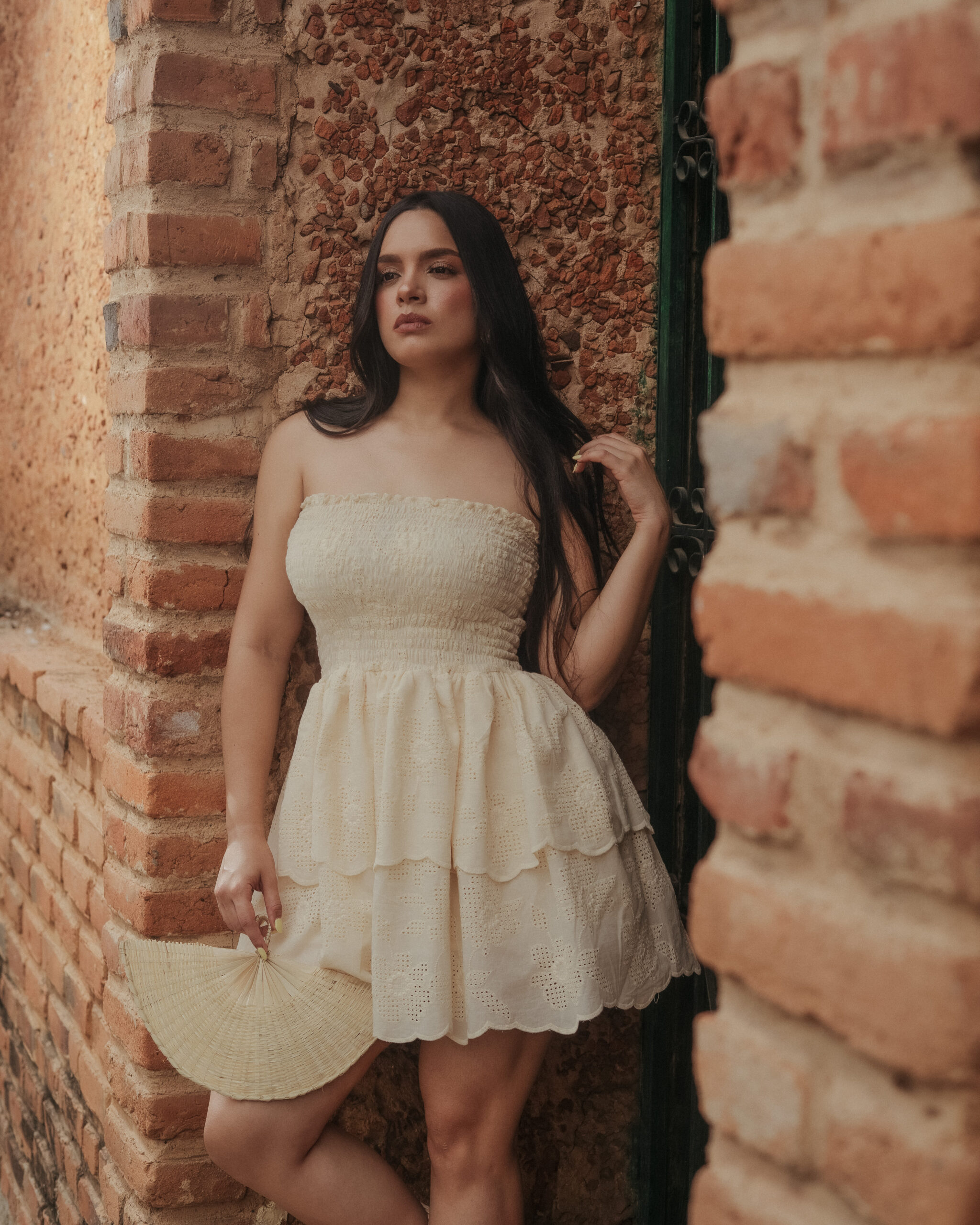 Vestido corto strapless en tono marfil en ojalillo y falda en capas que aporta volumen y movimiento. Un diseño fresco, femenino y perfecto para destacar con un look romántico.