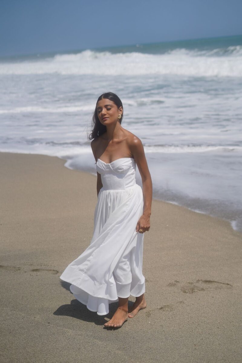 Vestido julio, elaborado en lino , refleja frescura, elegancia y sencillez, escote tipo corset, con cierre en la parte de atras.