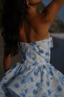 Vestido junio, elaborado en lino estampado, refleja frescura, elegancia y sencillez, escote tipo corset, con cierre en la parte de atras.