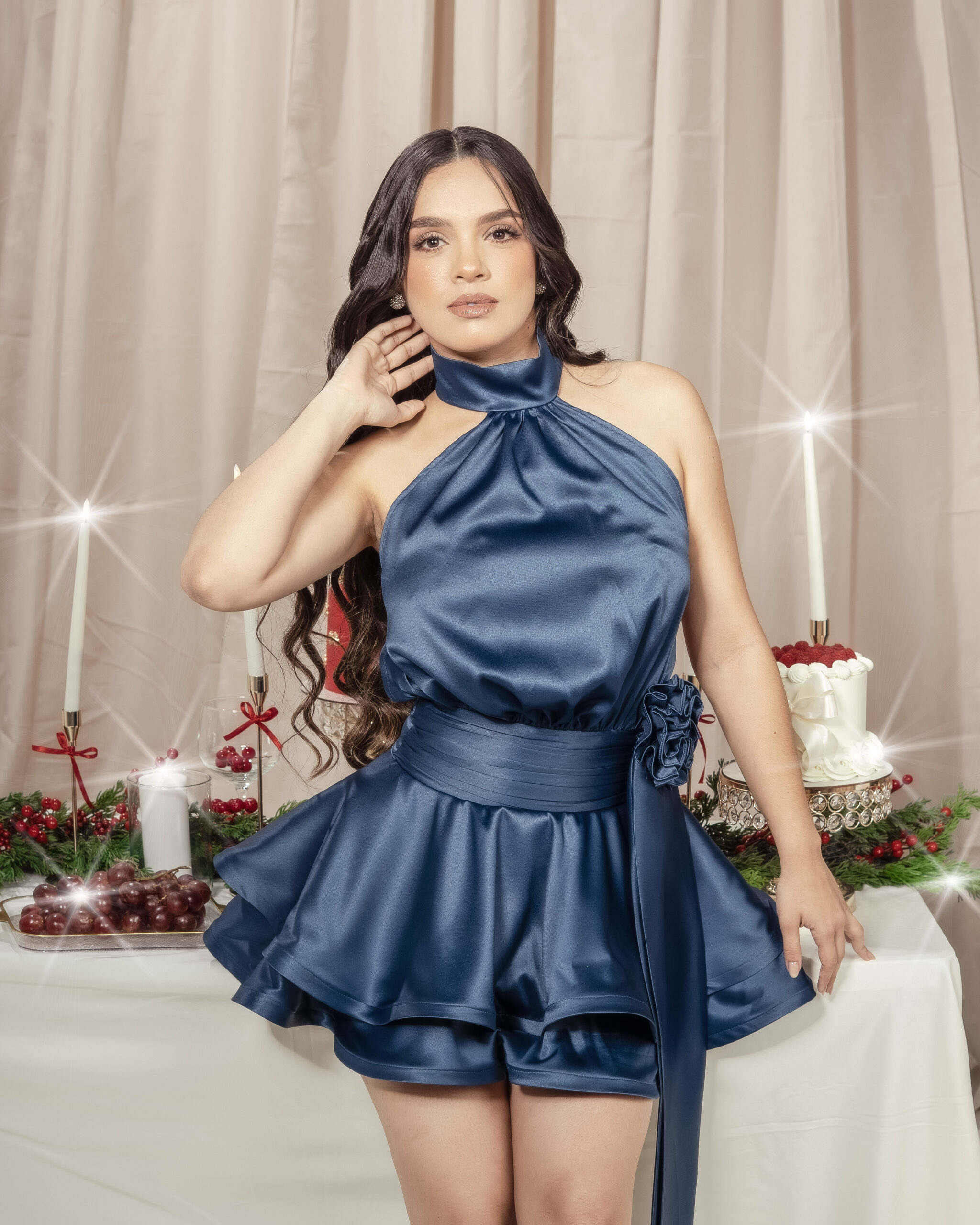 Vestido elaborado en seda. Este vestido corto es la definición de sofisticación moderna. Su cuello halter realza el porte, mientras que la falda con volumen y el lazo lateral añaden un toque coqueto y femenino. Ideal para destacar en celebraciones o noches especiales, donde el estilo habla por sí solo.