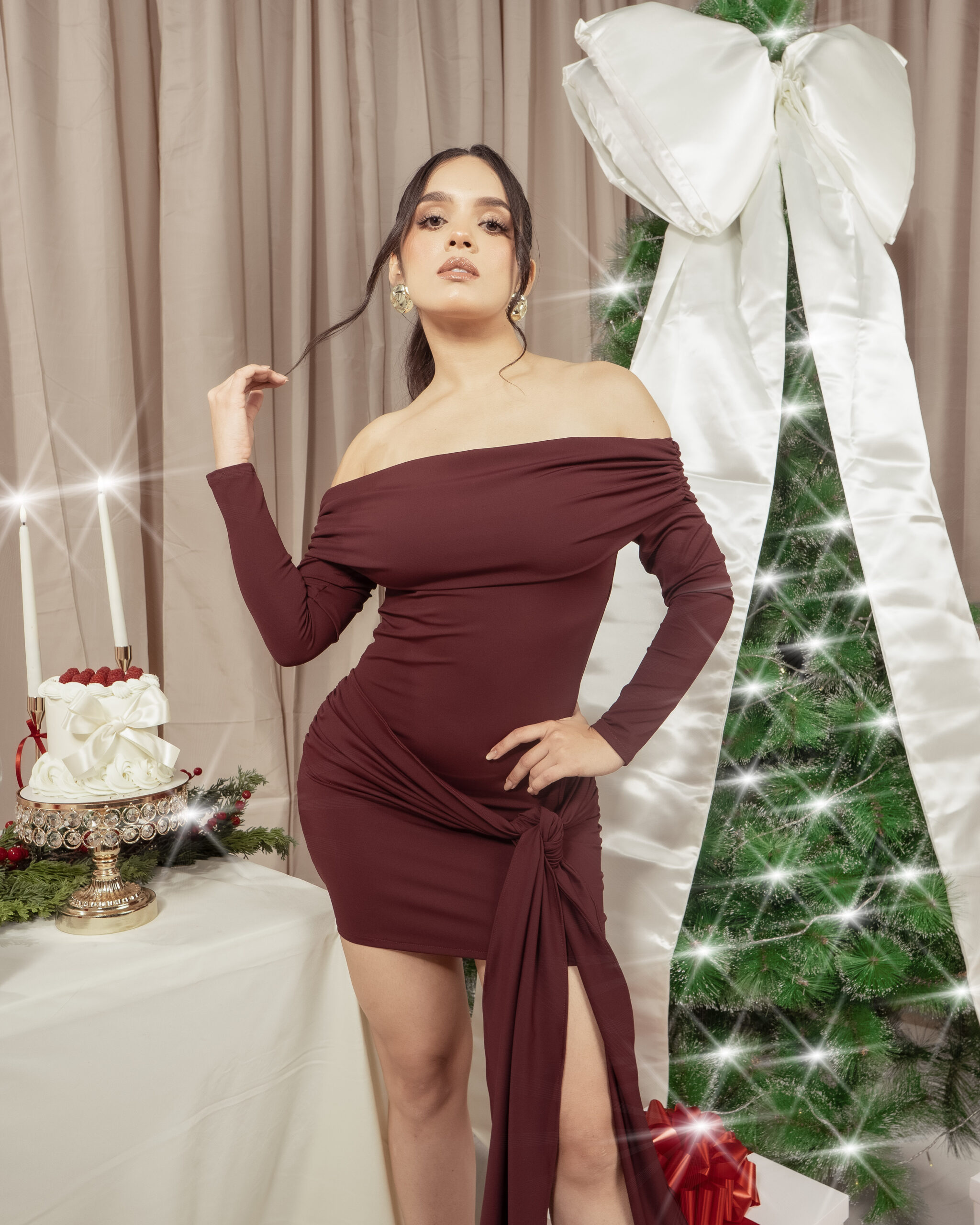 Vestido elaborado en licra. Este vestido color vino tinto combina la sensualidad del corte off-shoulder con la sofisticación de su caída drapeada al frente. Perfecto para brillar en cenas, celebraciones o eventos especiales, su diseño resalta la silueta con un toque moderno y femenino.
